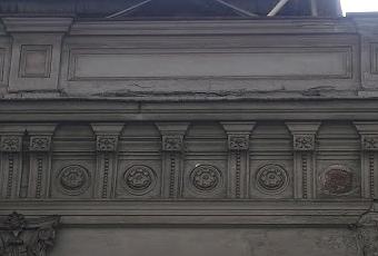 Recuperación de los Revocos Originales (c. 1880) de la fachada principal de la ex casa Goycolea. Zona típica Plaza de Armas. Centro Histórico de Santiago, Chile.