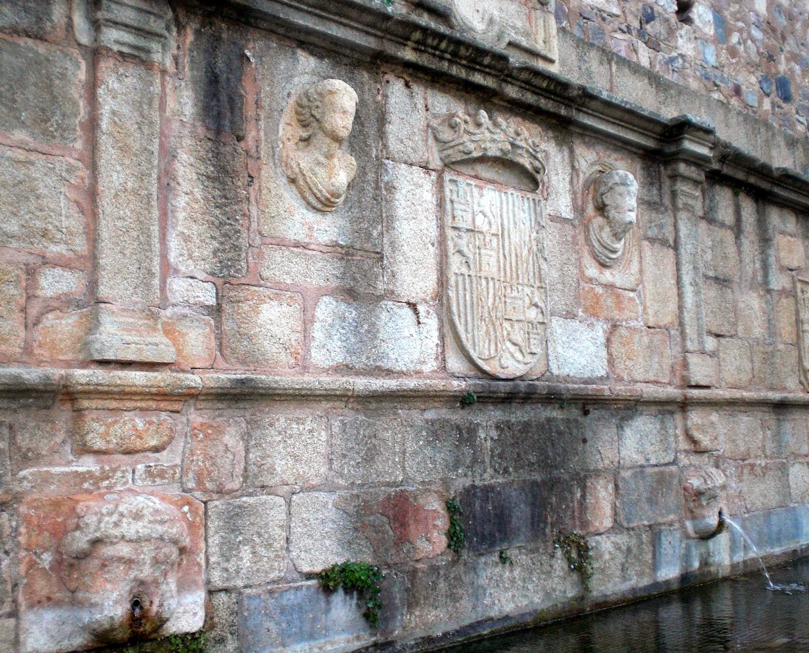 Abajo: sobre los tres arcos izquierdos de la Fuente del Concejo, de medio punto, se conserva el que está considerado escudo real labrado en piedra más antiguo de los conservados en la ciudad, cuartelado con las armas de León y de Castilla y datado, según algunos estudiosos, en el reinado de Juan II y años de principado del futuro Enrique IV, cuando la villa se convirtió durante un corto periodo de la historia en el señorío de este último.