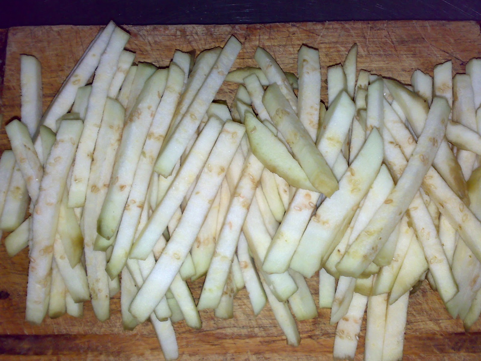 Cortamos las berenjenas en tiras y le colocamos sal. Dejamos reposar durante una hora, luego las pasamos por el colador para que boten bien el agua, las colocamos en un paño para que sequen bien y las sofreímos con el aceite vegetal.