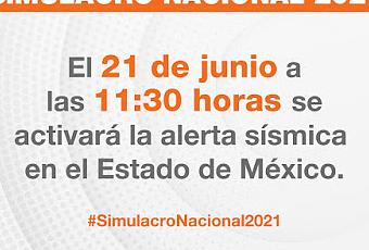 Toluca, Estado de México, 18 de junio de 2021. La Secretaría General de Gobierno, a través de la Coordinación General de Protección Civil, informó que el próximo lunes 21 de junio se llevará a cabo el Simulacro Nacional 2021, por esta razón, en punto de las 11:30 horas se activará la alerta sísmica en territorio mexiquense.