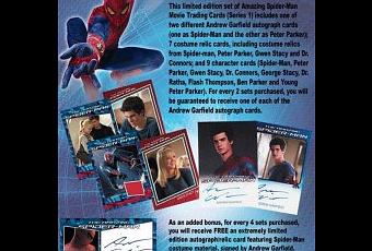 Gracias a un anuncio en internet de cartas coleccionables de la película The Amazing Spider-Man, tenemos un vistazo en baja resolución a algunas imágenes del filme, tres de ellas nuevas. Como se puede ver, estas cartas incluyen unas unidades autografiadas por el actor Andrew Garfield (Peter Parker) y otras con fragmentos de vestuario del reparto de la película, incluyendo algunas con fragmentos del traje de Spiderman.