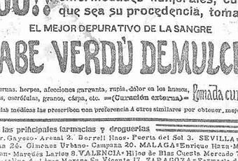 Aunque, al contrario de un dentífrico que hemos visto hace unas semanas y que se vendía en Imprentas y papelerías, este jarabe se vende en farmacias y droguerías y, como el anterior, lo cura todo: llagas, herpes, afecciones de garganta, manchas, granos, caspa... Es decir, te curaba lo que te oprimía en aquel momento y servía de pantalla de protección para otras póstulas que amenazaban con invadirte. PublicidadDiario de Alicante, 1909