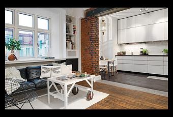 Hoy nos colamos detrás de la puerta de este pequeño apartamento escandinavo, de 44 metros cuadrados, aprovechados al máximo, para crear un espacio cómodo y acogedor. El apartamento cuenta con techos altos que le proporciona mayor amplitud y dos grandes ventanales que permiten el paso de luz natural. Destacando entre las paredes blancas, la separación de la zona de cocina con ladrillo natural, dando fuerza al ambiente. La cama se sitúa en un altillo, ganando espacio para colocar armarios y un escritorio en la parte de inferior. Fotos: Aluhem
