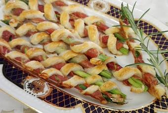 De las lonchas de jamón, hacer tiras de 1'5 cm de grosor.Al igual, cortar tiras del hojaldre, del mismo grosor y de la largura de los espárragos.Enrollar las tiras de jamón y a continuación las tiras de hojaldre.