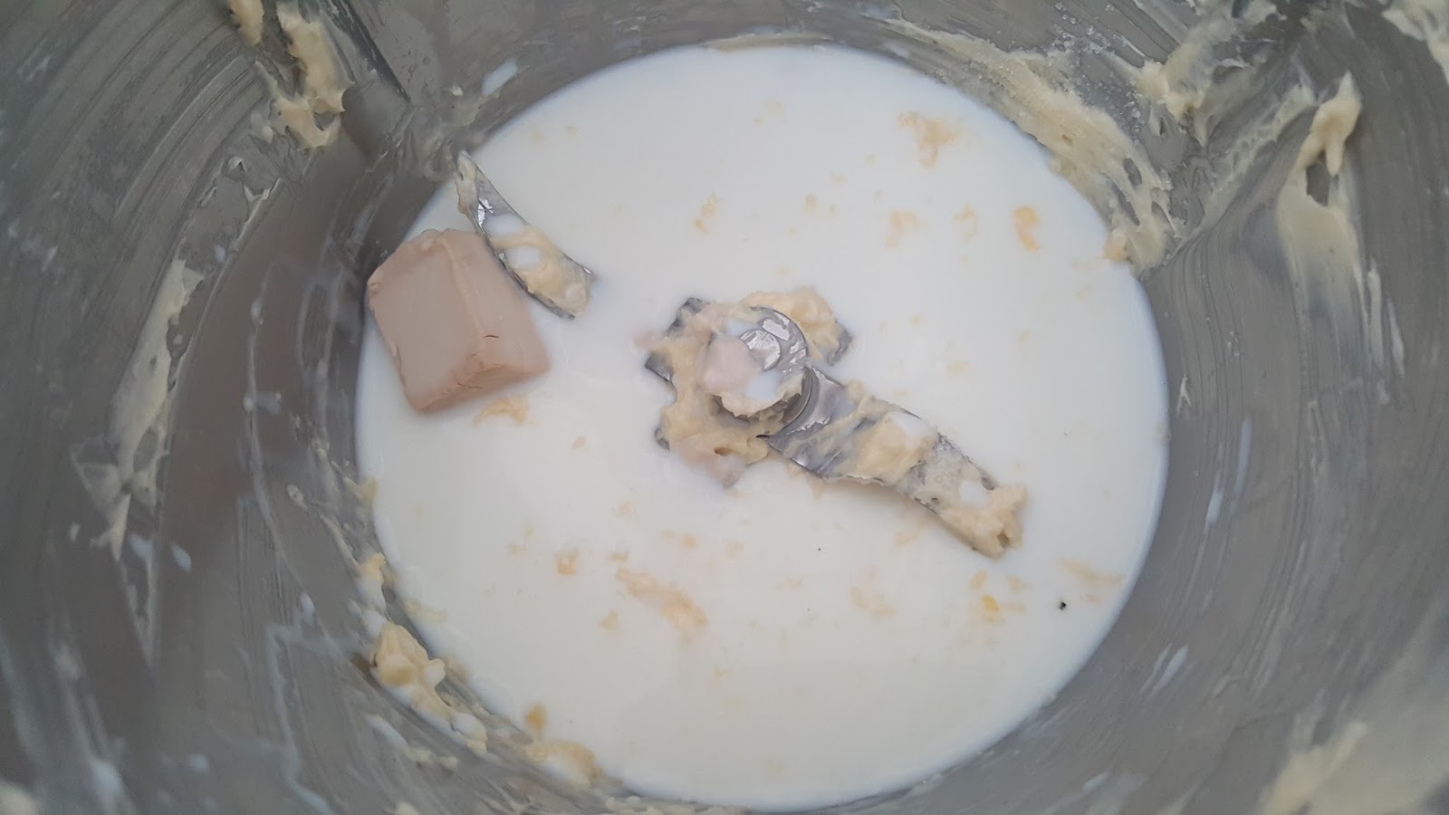 3. - En un bol, en este caso en la batidora, ponemos la levadura, el azúcar y le añadimos la leche templada, para que se disuelva la levadura, y mezclamos bien.
