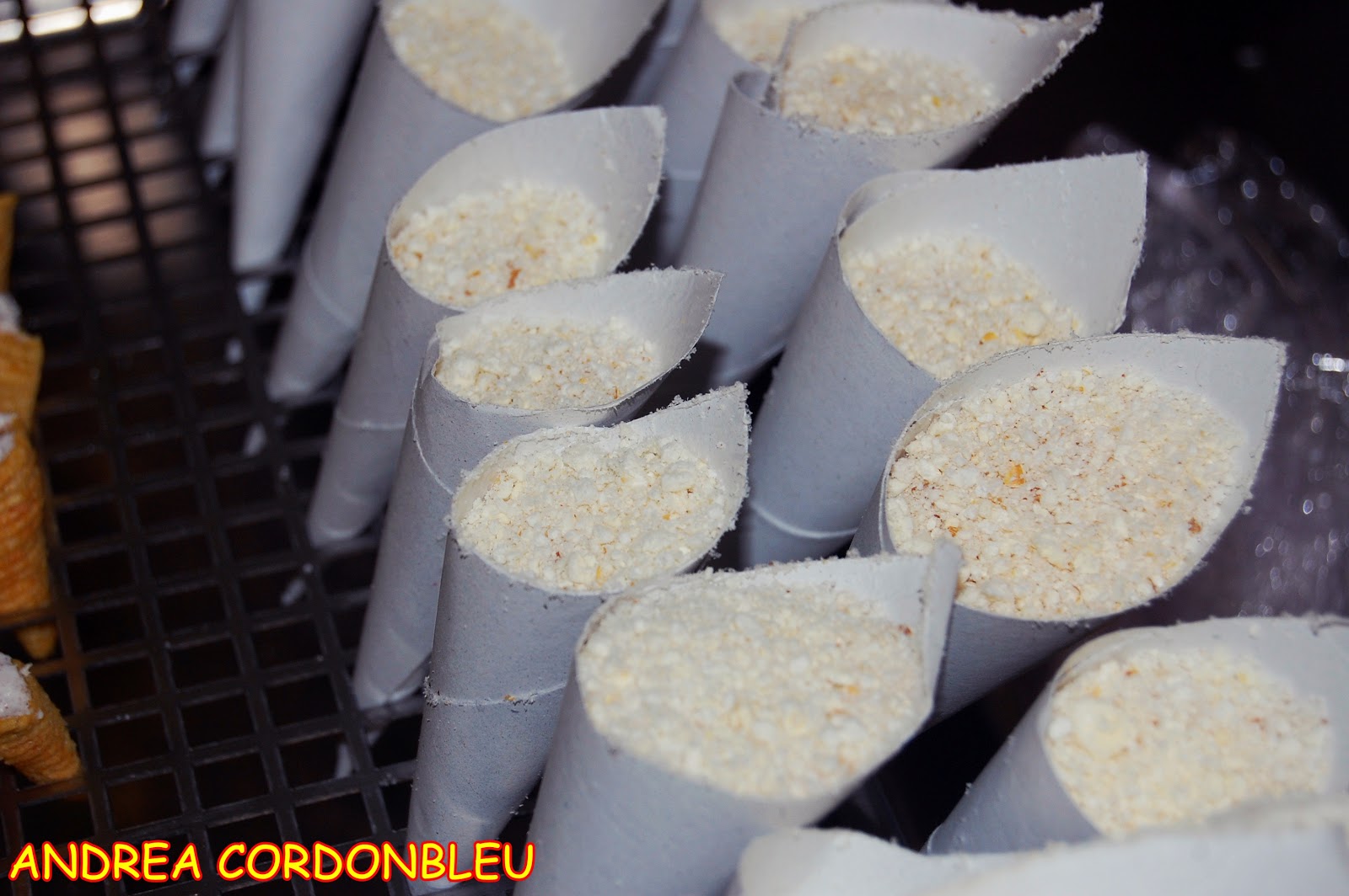 Se cocinan las palomitas en el microondas según las instrucciones del fabricante.Se ponen a punto de sal (normalmente están en su punto).Se trituran las palomitas en el vaso americano hasta obtener un polvo lo más fino posible.Se hacen unos cucuruchos o cartuchos con papel de estraza y se rellenan con el polvo de palomitas.Se pueden servir clavados en un cuenco lleno de granos de maíz.