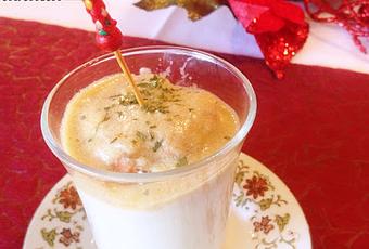 Para servir se pone en vasitos las 3/4 partes de puré de patatas, un gambón y se cubre con la salsa caliente.