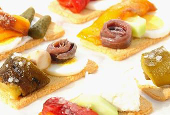 -huevo cocido, anchoa, pepino y una tira de pimiento asado escurrido del aceite y rociado con flor de sal.