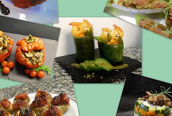 Calabacines rellenos de verduras y langostinos.
