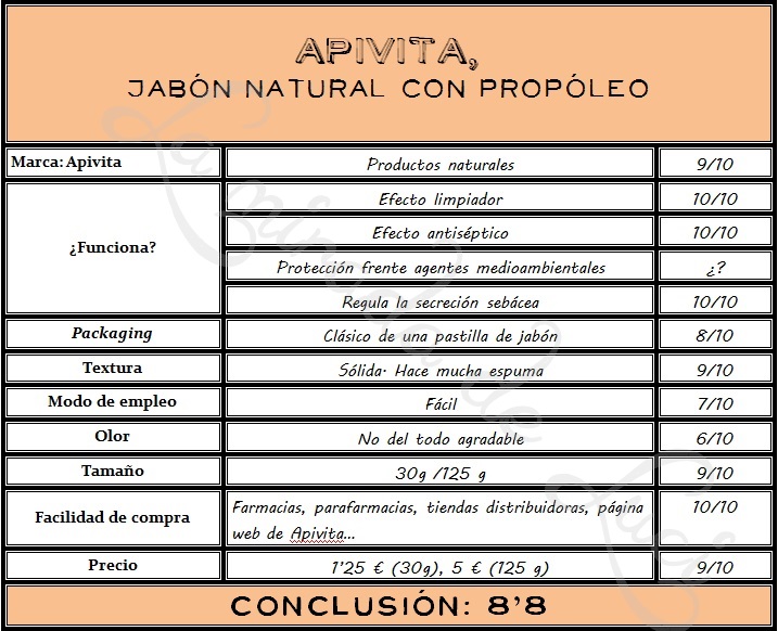 * Textura: sólida. Al contacto con el agua crea mucha espuma.* Modo de empleo:aplicar en la piel húmeda del rostro y/o cuerpo con movimientos suaves para formar espuma. Aclarar con agua abundante.* Olor:personalmente no me resulta agradable, pero sí soportable.* Tamaño: está disponible en 30 gramos y 125 gramos.* Dónde comprar:en farmacias, parafarmacias y tiendas que distribuyan la marca. A mí me lo hizo llegar Tequi. ¡¡Muchas gracias de nuevo, guapa!!* Precio: la pastilla de 30 gramos cuesta sobre 1’25 € y la de 125 gramos sale por unos 5 €.* Mi opinión: no puedo más que agradecer a Tequi el haberme descubierto este producto. En una etapa donde mi piel se encontraba muy mal, con brotes de acné y no sabía qué hacer con ella, fue uno de mis productos salvadores. Se notaba el efecto de limpieza profunda y en un tiempo récord (aproximadamente una semana) tenía mi brote de acné controlado. Desde entonces, se ha convertido en un básico para mí por su efectividad, sus ingredientes naturales y su increíble precio.LO QUE MÁS ME GUSTA ES…su efectividad.LO QUE MENOS ME GUSTA ES…su olor.