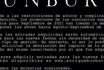 "Debido a las restricciones de aforos y complicaciones de producción, los promotores de los conciertos españoles previstos para septiembre de 2021 han tomado la decisión de posponer los shows hasta agosto y septiembre de 2022. Todas las entradas adquiridas serán automáticamente válidas para las nuevas fechas sin necesidad de realizar ningún tipo de gestión. No obstante, si así lo prefieres, podrás solicitar la devolución del importe de tu entrada a través del mismo canal-medio por el que fue adquirida. Si quieres adquirir entradas para las nuevas fechas, ya están disponibles en www.enriquebunbury.com. Lamentamos las molestias ocasionadas. Rock & Chicken".RELACIONADO