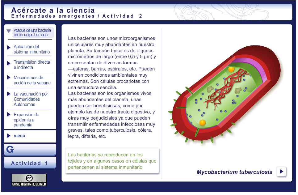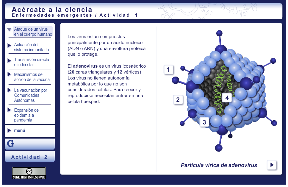 Acércate a la Ciencia: enfermedades emergentes es una aplicación multimedia que sigue una metodología dinámica. Esta actividad multimedia se basa en el aprendizaje activo de las ciencias y la tecnología a través de actividades multimedia con animaciones atractivas que implican al usuario en su autoaprendizaje y lo mantienen con un buen nivel de motivación.