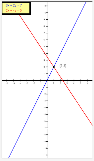 - Representación gráfica de la solución en un sistema de ejes cartesianos. Se puede apreciar el punto exacto de la intersección a la vez que se puede deslizar el panel para moverse por cualquier parte de la gráfica.