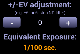 Y ya en la parte inferior tenemos los valores equivalentes, en la captura vemos que podemos variar la apertura y la sensibilidad para que la aplicación nos calcule el tiempo, si pulsamos sobre CALC F-STOP nos permitirá introducir la velocidad de obturación calculando automáticamente la apertura y si lo hacemos sobre CALC ISO nos calculará la sensibilidad ISO en función de los otros dos parámetros.