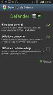 - Battery Defender: para quienes no tengan ganas de ahondar mucho tiempo en la configuración del ahorro de batería,Battery Defender puede ser una buena opción. Uno de los interesantes agregados es que nos muestra la vida de la batería directamente en la barra de notificaciones. Está orientado a involucrar menos trabajo de nuestra parte para ahorrar batería, como por ejemplo desactivando automáticamente las conexiones cuando la pantalla se apaga por más de 15 minutos, permitiendo que las aplicaciones se sincronicen cada 15 minutos, y hasta desactivando las conexiones cuando el equipo sabe que estamos durmiendo. Además, cuando llegamos a la recta final y tenemos poca batería, la aplicación desconectará la red de datos y elWiFi para poder ahorrar lo máximo posible mientras no usamos el teléfono. ?Las teorías para ahorrar batería?