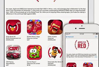 Para conmemorar el Día Mundial del SIDA 2014, Apple y los principales desarrolladores de aplicaciones invitan a sus clientes a participar en la campaña (RED) y ayudar así a alcanzar el objetivo de contribuir en el desarrollo de una generación libre de SIDA. Para las próximas dos semanas, una sección especial de la App Store llamada Apps (RED) ofrecerá 25 aplicaciones con contenido nuevo y exclusivo donde todos los ingresos irán directamente al Fondo Mundial de Lucha contra el SIDA (Global Fund to fight AIDS). Además Apple donará una porción de las ventas en las tiendas retail y en línea en todo el mundo en dos de los mayores días de compras del año: Viernes 28 de noviembre y el lunes 1 de diciembre.