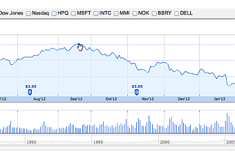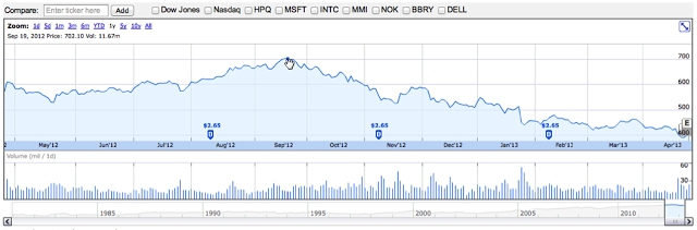 Apple se ha convertido en la empresa con mayor capitalización bursátil de todos los tiempos; en Septiembre del 2012 tocó un nuevo máximo histórico de $680.87 dólares, un máximo que superó al de Microsoft en 1999. Posteriormente, tocó los $700 dólares y después de esa cifra convirtió su gráfica cuesta abajo, como lo podemos ver en la siguiente gráfica anual: