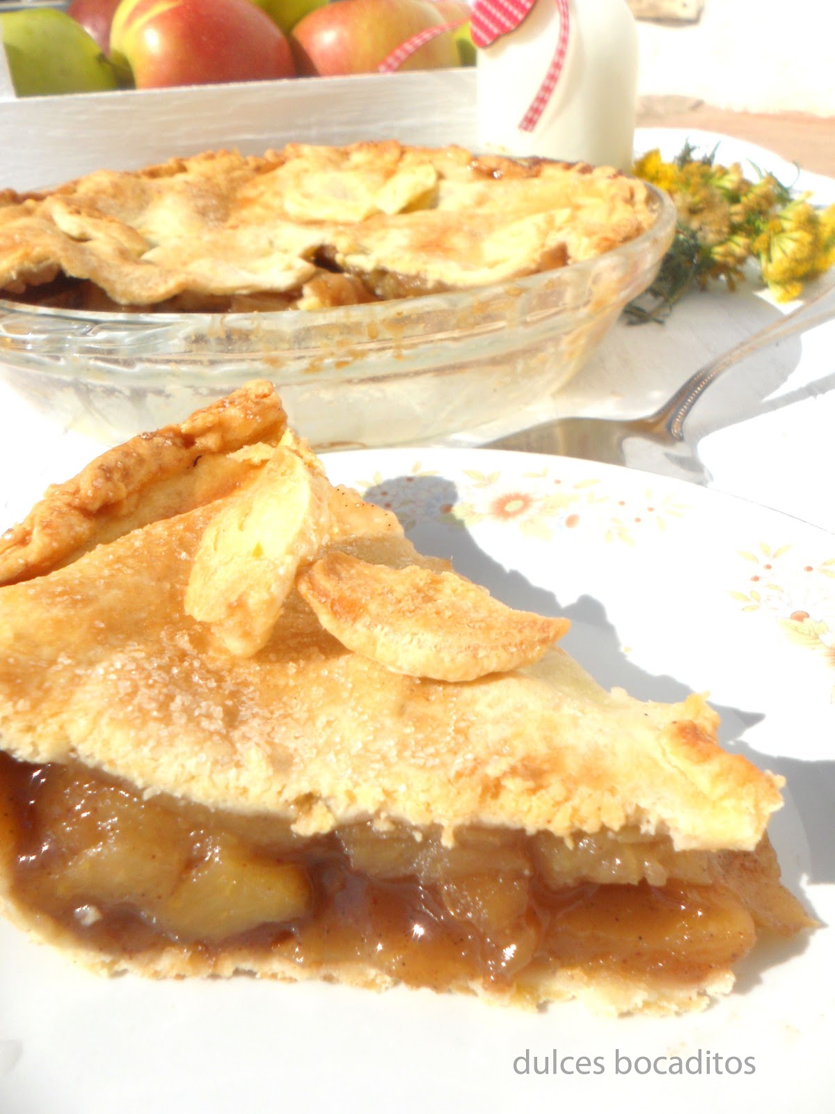 PREPARACIÓN:Calienta la mantequilla en el microondas hasta que esté suave, pero no derretida.mezclar en un bol 2 tazas de harina para todo uso, una cucharadita de sal, y la cucharada de azúcar. a continuación, 6 cucharadas de mantequilla, 6 cucharadas de manteca, y 6 a 8 de agua helada, mezclar todo bien hasta obtener una masa que no se nos pegue en las manos.tapamos con un film y metemos en la nevera mínimo 30m. Mientras vamos haciendo nuestro dulce y cremoso relleno.Pelar y cortar las manzanas.Remojar en agua con una cucharada de jugo de limón. Así evitaremos que se nos oxiden.En un bol mezclar todos los demás ingredientes del relleno, escurrimos las manzanas y las metemos en el bol mezclamos todo muy bien y dejamos reposar unos 5m.Sacamos la masa de la nevera y la estiramos,la ponemos en nuestro molde,pinchando el fondo con un tenedor y ponemos encima el relleno, tapamos con otra capa de masa y dejamos en el centro un pequeño agujero para que salga el vapor, pintamos con leche y espolvoreamos un poco de azúcar.Metemos al horno precalentado a 180º unos 50 minutos según horno.Podemos servir con helado de vainilla o creme fraiche.