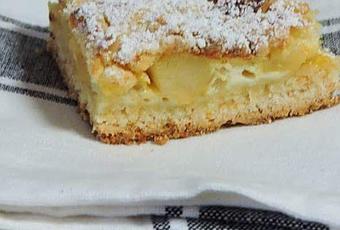 Cortamos las manzanas en trocitos, y las rehogamos en un cazo con mantequilla, cúrcuma y azúcar. Mezclamos el polvo de puding con agua y la cantidad de azúcar que indica en el embalaje. La añadimos a la manzana y mezclando le damos un hervor. Dejamos enfriar el relleno, mientras extendemos la masa sobre papel para hornear. Preparamos un merengue francés con las claras y el azúcar. Cuando el relleno está frío, la mezclamos con el merengue francés y la ponemos sobre la masa. Nivelamos el relleno, sacamos la masa del congelador y rallamos sobre el relleno, formando la capa superior de la tarta.