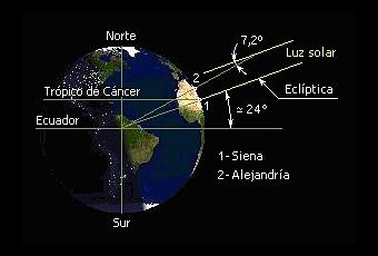 Eratóstenes dirigió la biblioteca de Alejandría desde el año 236 a.c, hasta su muerte en el 194 a.c., es curioso que muchos grandes genios dirigían bibliotecas o trabajaban en oficinas de patentes. Eratóstenes sabía que en la ciudad de Siena (hoy Asuán) en el sur de Alejandría durante el solsticio de verano el Sol a medio día se situaba en la vertical, las objetos no proyectaban sombra y el Sol se reflejaba en el fondo de los pozos. Ese mismo día en Alejandría el Sol no estaba vertical y daba una pequeña sombra. Si el mundo fuera plano las sombras en todos sus puntos deberían de ser iguales (esto claro si el Sol está tan lejos como para que sus rayos nos lleguen paralelos, ya que no se proyectan las sombras de las misma forma podemos deducir que la tierra es redonda).