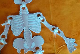 Cuando trajo a casa el recortable con los distintos huesos, vi que era un juego de esos troquelados que van punteados para recortar con los dedos.Lo recortamos y unimos las piezas con hilo para que tuviese bastante flexibilidad. Ya se que hay una chinchetas especiales, en las que se doblan las patitas para hacer este tipo de manualidades pero no teníamos en casa. Con un hilo gordo unimos los distintos huesos hasta formar el esqueleto como se ha hecho toda la vida, cuando no tienes otra cosa a mano en ese momento.En cada hueso ya venían los agujeros para poder unirlo al siguiente, y así formamos el esqueleto completo.