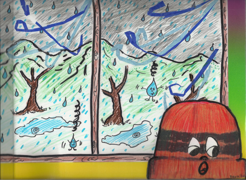 AL CABO UNOS DÍAS AL ACERCARSE A LA VENTANA,EL GORRO ROJO VIÓ QUE EL CIELO ESTABA MUY NEGRO, LLOVÍA MUCHO(Con dos o cuatro dedos de una mano golpeamos la palma de la otra muy rápido imitando el sonido de la lluvia), EL VIENTO SOPLABA MUY,MUY FUERTE (Hacemos el sonido de un viento fuerte ¡FUUUUU, FUUIUUUUUU!), Y LAS GOTITAS DE LLUVIA QUE RESBALABAN POR EL CRISTAL LE DECÍAN AL GORRO: ¡HEEE,QUE EL FRÍO Y EL INVIERNO HAN LLEGADO!YUPI, JAJAJA!Y EL GORRO ROJO SE LLEVO UN SUSTO ¡OOOOOOOOHHHH!(preguntamos a los niños ¿como sonaba la lluvia que caía,flojito(hacemos el ruido con dos dedos suavemente( o fuerte, hacemos el ruido con cuatro dedos muy fuerte) y¿Qué se llevó el gorro?(hacemos el ruido del susto abriendo mucho los ojos y la boca haciendo ¡Ohh! y con las manos en las mejillas)