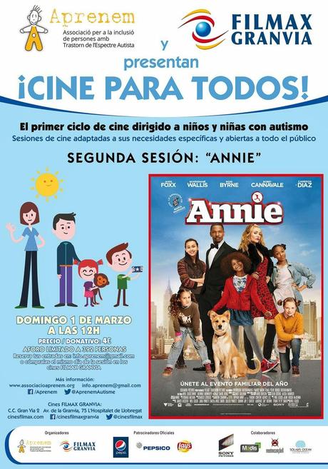 El proyecto ha contado con la colaboración de los Cines Filmax Granvia en la creación de la sesión y es patrocinador conjuntamente con Pepsico del proyecto. Contamos también la colaboración de Madis, Impresión de gran formato, Meet Mr. Campbell y Solaris Ocean como estudios de diseño, así como de Sony Pictures.La entrada-donativo es de 4 euros y se podrá comprar directamente en el cine el mismo día de la sesión. También se pueden reservas las entradas enviando un email a: [email protected] (se abonarán el mismo día de la sesión). Aforo limitado: 392 butacas.APRENEM nace en 2006 por iniciativa de un grupo de familias con el objetivo de defender los DERECHOS de sus hijos a recibir una atención adecuada a su especificidad.TOMA NOTA DE LOS DETALLES:Día: Domingo, 1 de MarzoHora: 12:00hLugar: Cine Filmax Granvia del Centro Comercial Gran Via 2 - Avda. Gran Via, 75 L'Hospitalet de Llobregat (Barcelona)Película: ANNIE, de Will Gluck.Fuentes: