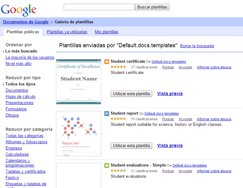 La galería cuenta con una amplia variedad de plantillas pertenecientes a diferentes temas desde plantillas de álbumes de fotos hasta modelos de currículum vitae. Se puede refinar la búsqueda ya sea por tipo o categoría. Por ejemplo, puede realizar una búsqueda por solo hojas de cálculo o plantillas de Presentaciones haciendo clic en "Spreadsheets" o Presentaciones.También se pueden ordenar estas plantillas por frecuencia de uso. Y si sucede que has hecho su propia plantilla en Google Drive y deseas compartirla con otros usuarios, puedes enviarla mediante el botón "enviar una plantilla" en la parte superior derecha.