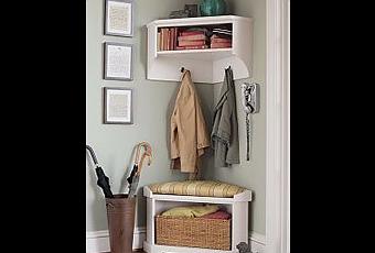 Nos ha precido muy ingeniosa esta manera de aprovechar la esquina de una recibidor para montar un set de llegada a la entrada de una casa. Como ves hay sitio para todo: abrigos, paraguas, banqueta, etc. Un diez para este diseño ideal para pisos pequeños.