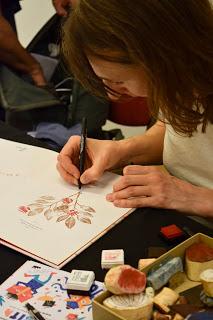 Luego del panel y los aplausos agradecidos, los tres estuvieron más que disponibles para firmar/ilustrar libros, conversar con los oyentes y hasta sacarse fotos. Así, mezclando francés e inglés, tuve la oportunidad de que Marjorie me decorara un libro. Acá, un video, donde se puede ver el uso de los sellos típico de su estilo: