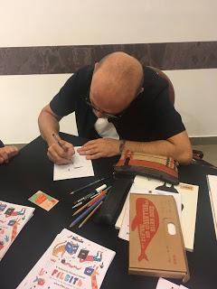 Luego del panel, Raúl Guridi firmando/ilustrando un libro.