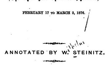 Se siguen análisis de Gunsberg y Jan van Reek. 1.e4 e5 2.f4!? Gambito de Rey. 2...exf4 Aceptado. 3.Ac4 [3.Cf3] 3...Cf6! Steinitz sigue los pasos de su predecesor, el gran Paul Morphy!. [3...Dh4+; 3...d5; 3...d6; 3...Cc6] 4.Cc3! El rápido desarrollo de piezas es fundamental cuando se está en tiempo de "gambito". [4.e5 d5 5.Ab3 Ce4 6.Cf3 Ag4 7.0-0 Cc6 8.Aa4 g5 9.Axc6+ bxc6 10.d4 c5 11.c3 Ae7 12.b4 cxb4 13.cxb4 0-0 14.Db3 Tb8 15.a3 c5 16.Cc3 Cxc3 17.Dxc3 cxb4 18.axb4 Axb4 19.Dd3 a5 20.h4 h6 21.hxg5 hxg5 22.g3 Tb6 23.Ta2 Tg6 24.Tg2 Ah3 25.e6 Axg2 26.exf7+ Rg7 27.Rxg2 Dc8 28.Ce5 Th6 29.gxf4 Tfh8 30.fxg5 Th2+ 31.Rg1 Th1+ 32.Rf2 T8h2+ 33.Re3 Th3+ 34.Cf3 Txf3+ 35.Txf3 Dxc1+ 36.Rf2 De1+ 37.Rg2 Dg1# 0-1 Anderssen,A-Morphy,P/Paris 1858] 4...Cc6 [Con el paso de los años se demostró superior: 4...c6! como el propio campeón mundial de entonces tuvo ocasión de ver en una partida simultánea ofrecida en Inglaterra en aquellos días del gran torneo!: 5.e5 d5 6.exf6 dxc4 7.De2+ Ae6 8.fxg7 Axg7 9.Cf3 Cd7 10.d3 cxd3 11.cxd3 Dc7 12.Ad2 0-0-0 13.Ce4 Ce5 14.Cxe5 Axe5 15.0-0 Thg8 16.Rh1 h5 17.Df2 f5 18.Cc5 Ad5 19.Tg1 h4 20.h3 Tg3 0-1 Lasker,Emanuel-Jacks,T/Great Britain tour sim 1895] 5.d4?!N Provoca un razonable movimiento del alfil de rey negro. [Como Chigorin había demostrado en una partida por correspondencia, era mejor: 5.Cf3! Ab4 6.0-0 d6 7.Cd5 Cxd5 8.exd5 Ce5 9.Cxe5 dxe5 10.d4 De7 11.Ab5+! (11.c3 Ad6 12.dxe5 Axe5 13.Axf4 Axf4 14.Txf4 0-0 15.Dd4 Ad7 16.Taf1 Dd6 17.Df2 f5 18.Tf3 Tf6 19.Te1 f4 20.Td3 Rf8 21.Rh1 b6 22.Df3 Te8 23.Txe8+ Axe8 24.b4 De5 25.Rg1 Ah5 26.Df2 Ae2 27.Td4 f3 28.Ad3 Axd3 29.Txd3 fxg2 30.Tf3 Re7 31.Txf6 gxf6 32.c4 h5 33.Rxg2 De4+ 34.Df3 Dxc4 35.De3+ Rd8 36.Dd2 Rd7 37.h3 Rd6 38.Db2 Dxd5+ 39.Rf2 Df5+ 40.Rg2 h4 41.a4 De4+ 42.Rf2 Df4+ 43.Rg2 Dg3+ 44.Rh1 Dxh3+ 45.Rg1 Dg3+ 46.Rh1 Df3+ 47.Rg1 h3 48.Dd2+ Re7 49.b5 Dg2+ 50.Dxg2 hxg2 51.Rxg2 Re6 52.Rf3 Rf5 0-1 Paulsen,L-Dubois,S/London 1862) 11...c6 12.dxc6 0-0 13.c4 exd4 14.a3 Ad6 15.Axf4 Axf4 16.Txf4 De3+ 17.Tf2 b6 18.Dd2 a6 19.Aa4 Ae6 20.Te1 Dxd2 21.Txd2 Axc4 22.Txd4 Ab5 23.Axb5 axb5 24.Te7 Tac8 25.c7 g6 26.Td6 1-0 Chigorin,M-Grabbe,N/corr 1889] 5...Ab4! Steinitz todo un "teórico del medio juego", no pierde la oportunidad de luchar por el centro. 6.Dd3 0-0 7.Cge2 d5! Rompiéndolo y facilitando el desarrollo de las piezas negras. 8.exd5 Diagram