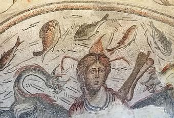 Mosaico con representación de la diosa del mar Tetis, flanqueada por dos Ketos o monstruos marinos. Completaban la escena delfines dorados y otras especies marinas. Siglo IV d.C. Marroquíes Altos, Jaén. Expuesto en el Museo Provincial de Jaén.