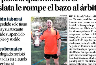 Un árbitro menor de edad ha perdido el bazo a consecuencia de una paliza propinada por un jugador, el pasado domingo, durante un encuentro de segunda regional valenciana que enfrentaba al Mislata UF 'B' y a Los Silos CF 'A', en el polideportivo municipal de Burjassot.El colegiado, Héctor Giner Tarazón, de 17 años, sufrió la brutal paliza por parte de un jugador del Mislata, miembro de la Policía Nacional, al que le había enseñado tarjeta roja por protestar una decisión. El futbolista, según los testigos, se cebó con el árbirtro a puñetazos y a patadas.El jugador, que responde a las siglas de A. M. M., es un agente del Cuerpo Nacional de Policía que estaba destinado a la Unidad de Protección y Seguridad de la Brigada de Seguridad Ciudadana, según ha confirmado el diario 'Levante'. El agente, de 27 años, fue detenido por compañeros de la comisaría de Burjassot y, tras pasar la noche en el calabozo, pasó a disposición judicial.