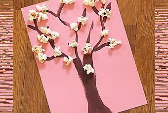 ¿A vuestros hijos les gustan las palomitas? Sí es así, esta manualidad sera rica, rica. Es sencillísima de hacer y el resultado es muy bonito. Sólo necesitáis una cartulina, algún tipo de pintura y unas palomitas de maíz (se puede sustituir por otro material como papel de seda o algodón). Vía: Preschool Rock