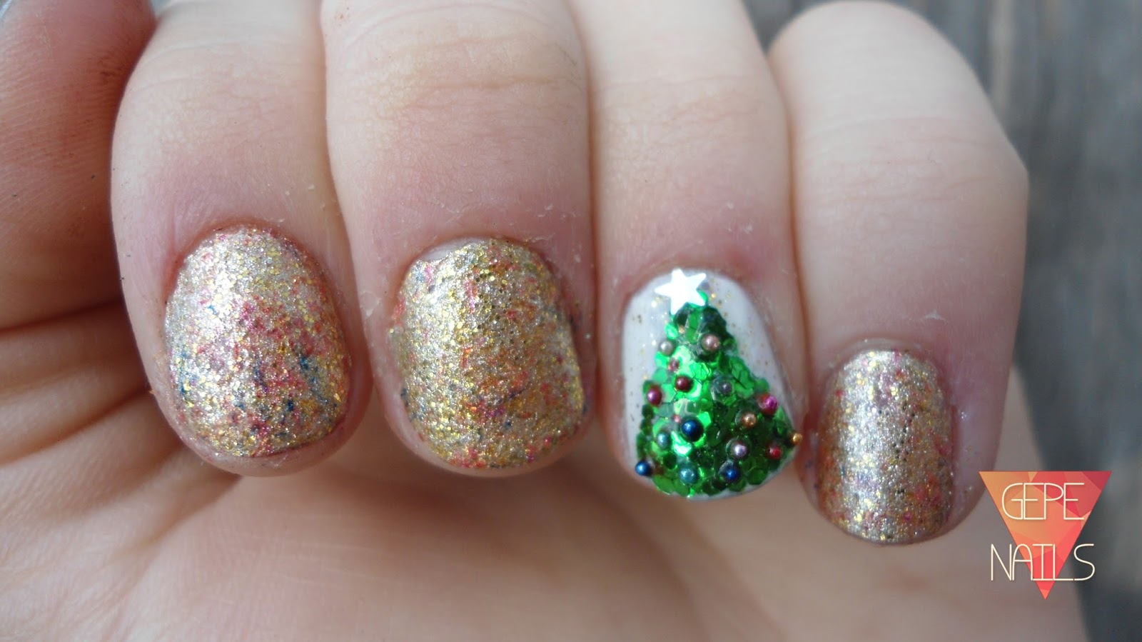 Como había fallado mi dibujo estrepitosamente, pensé en hacer un árbol de purpurina. Así que puse con el mismo pincel del top coat, un triángulo, y encima eché purpurina verde, que pedí hace un año a BPS.