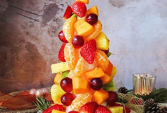 No es más que frutas variadas servidas en forma de árbol de Navidad, ponerlo en la mesa ya es en sí un postre de fiesta, vistoso y apetecible.