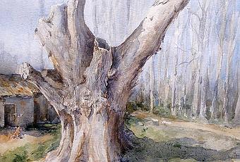 Un papel con grano grueso y pinceladas con el pincel bastante seco a lo largo de troncos y ramas permite sugerir la rugosidad de la corteza de esta encina, sus grietas y su aspereza.