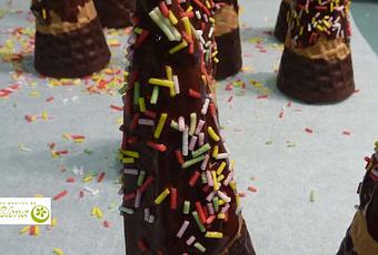 Esta receta es de las que yo clasifico de manualidad más que de cocina. Pero bueno, la hizo mi hijo mayor en el colegio esta semana y quería volver a hacerla conmigo y con su hermano. Se lo pasaron muy bien y quedan unos arbolitos bastante vistosos. Ingredientes - cucuruchos de helado. - chocolate para fundir. - fideos de colores. Elaboración Fundimos el chocolate, pintamos los cucuruchos y les echamos los fideos por encima a modo de nieve. Dejamos que el chocolate se seque y listo.