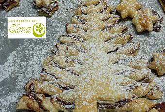 Extendemos una lámina de hojaldre encima de un papel de hornear, untamos con nuella y ponemos la otra lámina encima. Con ayuda de una puntilla dibujamos un árbol de navidad como se puede ver en las fotos. Luego vamos marcando las ramas que iremos girando sobre si mismas. Pintamos con leche y metemos en el horno precalentado a 200ºC hasta que se cocine el hojaldre.