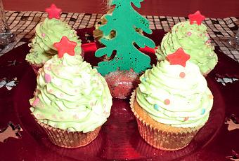 Pasado un rato empezamos a decorar los cupcakes, en este caso solo me dió para decorar 6 cupcakes porque el hacer los arbolitos llevan mucha cantidad. Seguidamente decorar con adornos comestibles, y con fondant rojo hacer la estrella.