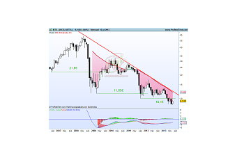 Sin embargo, entre junio del 2012 y abril del 2013 podemos apreciar cómo se ha dibujado una divergencia alcista entre el Macd y el precio, lo que significa que podríamos ver un pequeño ascenso en el precio que en principio le podría llevar hasta alcanzar la directriz bajista que le viene acechando desde hace 5 años.