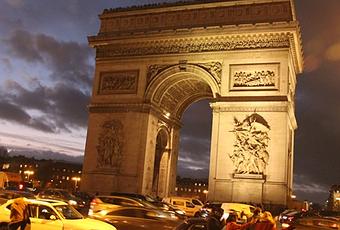Se levanta entre 1806 y 1836 por orden de Napoleón Bonaparte para conmemorar la victoria en la batalla de Austerlitz y cumplir así con la promesa que les hizo a sus hombres: "Volveréis a casa bajo arcos triunfales". Se localiza en el extremo occidental de los Campos Elíseos, a dos kilómetros de la Plaza de la Concordia. En las caras exteriores del Arco se grabaron los nombres de grandes revolucionarios y las victorias de Napoleón I. En los muros interiores se grabaron los nombres de 558 generales del Imperio francés.