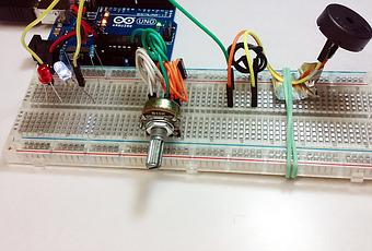 Controla el zumbador y los LEDs con el potenciómetro. El programa permite utilizar el potenciómetro para variar el tiempo de apagado y encendido de ambos LEDS y el tiempo de sonido del zumbador.