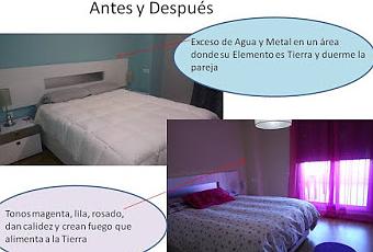 Antes y Después del Área de las Relaciones de una alumna on-line de Feng Shui.Aquí os dejo la foto del cambio del cuarto de una pareja en el Área de las Relaciones de la casa, decorada antes en tonos azules y blancos, había un exceso de Agua y Metal que generan frialdad en el ambiente, además teniendo en cuenta que esta área es de Elemento Tierra, se veía agotado constantemente por lo comentado antes.