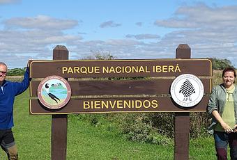 Nos entrega un folleto del P.N. de los Esteros de Iberá y le agradecemos, pues hay información e ilustraciones de los animales que viven en el parque y las especies que se han introducido en cada portal con tanto esmero y esfuerzo.