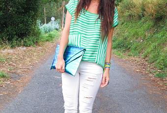 Se acerca el otoño y con él la hora de ir introduciendo tonos menos veraniegos, PUES NO!!! Yo sigo adelante con los colores estridentes que tanto me gustan. Como véis un look muy sencillo; unos jeans, un top especial, tacones y un arm party lleno de color.