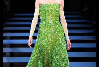 En sus texturas utiliza la más alta tecnología creando tejidos tipo panal de abeja, paillettes tomando forma de palmeras y cristales Swarovski, para llegar a la confluencia de una manera de vestir con el mundo animal y vegetal (bolsos en cocodrilo, mitones de pitón y lagarto).