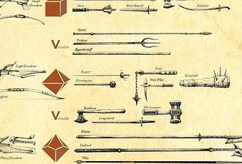 Es una ilustración donde se asocian diferentes armas, armamento típico de la fantasía medieval europea, tanto de cuerpo a cuerpo como de disparo de D&D con el dado que usan para contabilizar el daño que hacen.