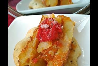 -Tortilla de patatas rellena de pisto y aceitunas de gran calidad con toque de pimiento asado y sal de cítricos sobre Marinera con semilla de chía.